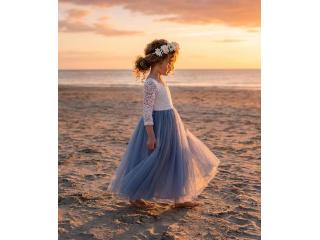 Dusty Blue Gray Tulle Ball Gown, White Lace Flower Girl Dress for Girls, Wedding or Special Occasion Dubuque