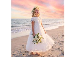 This vintage-inspired flower girl dress blends bohemian charm with feminine elegance. It features a delicate crochet lace bodice with cap sleeves and flows into an airy ankle-length tulle skirt. The soft, romantic silhouette makes it perfect for weddings, portraits, christenings, and special celebrations.